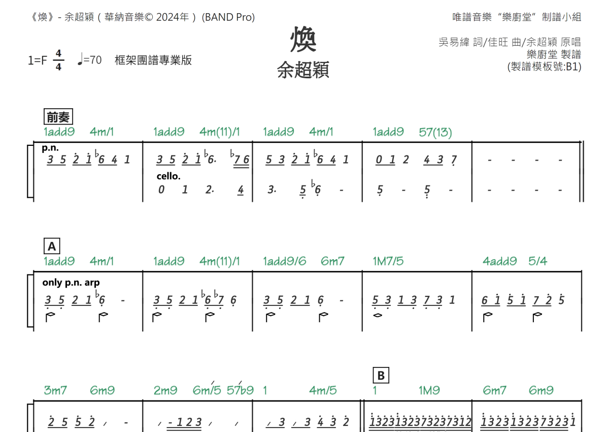 “乐厨堂”乐谱发布小组: 出版级乐谱扒谱制谱——以职业乐手圈通行标准记谱,遵循原版和声、伴奏元素和段落结构。 ❶ 2.0多功能专业团谱:采用台湾卓著公司开创的二代简谱标准制作。二代简谱无疑是迄今为止最科学、最易读的专业范畴多功能记谱方案:❷ 框架谱:采用职业乐手通常记谱方案制作。