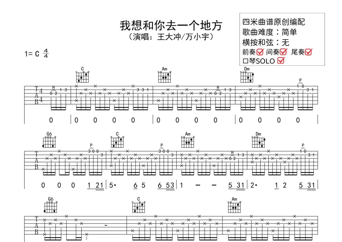 我想和你去一个地方吉他谱 - 王大冲/万小宇演唱 - C调弹唱六线谱