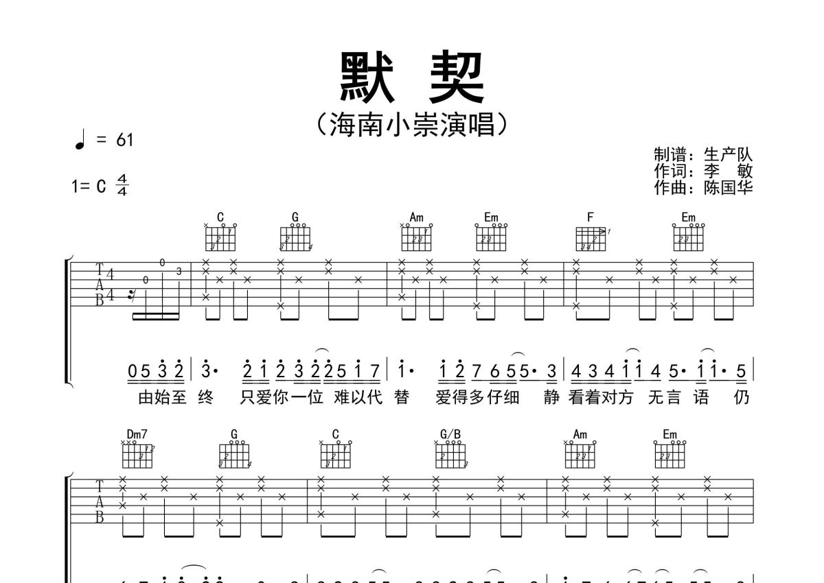 《默契》是海南小崇演唱的一首歌曲,精编完美版,拍号为4/4拍,歌曲速度为每分钟61拍,歌曲原调为C调,本吉他谱采用的是C调指法编配,演奏时不需要使用变调夹即为原调,这份吉他谱共有两张高清图谱,图谱由 @生产队 编配上传,图谱使用六线谱编配,包含吉他和弦指法、简谱以及歌词部分,使用这份默契吉他谱,可以让你更加方便地掌握这首歌曲的弹唱技巧,快来尝试吧。海南小崇演唱的歌曲《默契》原版吉他谱,含间奏solo编配,精编完美版,热门歌曲,值得推荐!。