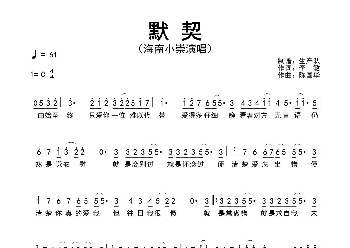 《默契》是海南小崇演唱的一首歌曲,原版简谱,拍号为4/4拍,歌曲速度为每分钟61拍,这份简谱共有一张高清图谱,图谱由 @生产队 编配上传海南小崇演唱的歌曲《默契》原版简谱,含间奏solo编配,精编完美版,热门歌曲,值得推荐!。