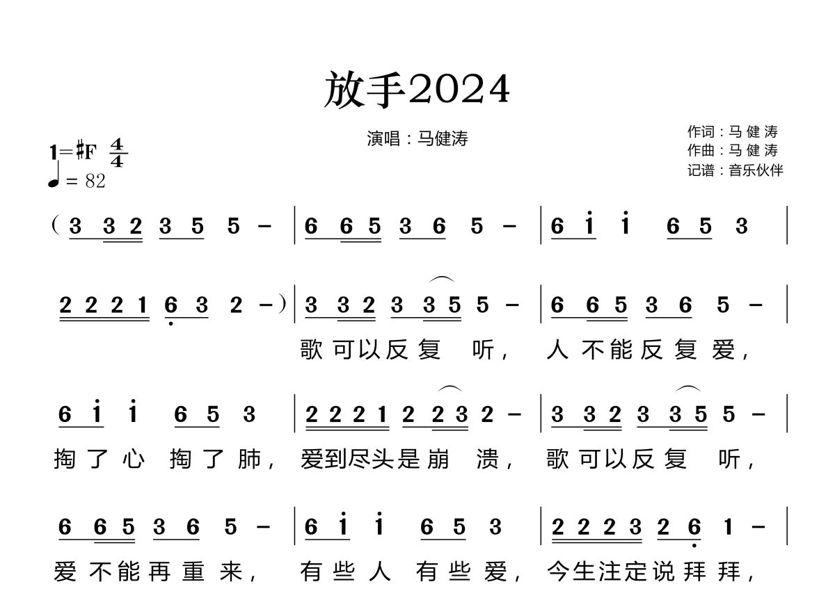 《放手2024》是马健涛演唱的一首歌曲,拍号为4/4拍,歌曲速度为每分钟82拍,这份简谱共有两张高清图谱,图谱由 @音乐伙伴 编配上传。