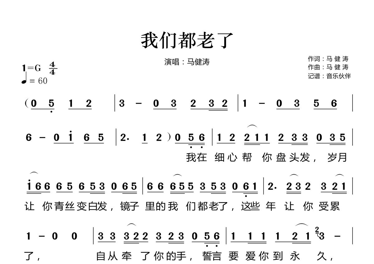 《我们都老了》是马健涛演唱的一首歌曲,拍号为4/4拍,歌曲速度为每分钟60拍,这份简谱共有两张高清图谱,图谱由 @音乐伙伴 编配上传。