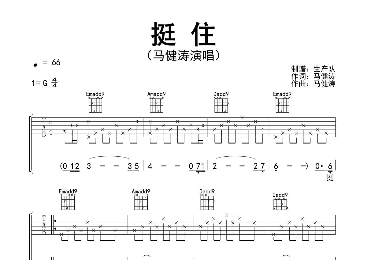 马健涛《挺住》吉他谱 - G调弹唱六线谱 - 精编完美版