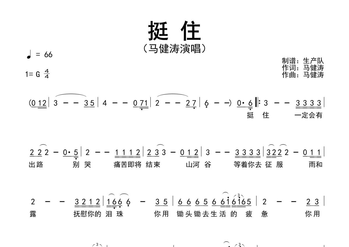 《挺住》是马健涛演唱的一首歌曲,原版简谱,拍号为4/4拍,歌曲速度为每分钟66拍,这份简谱共有一张高清图谱,图谱由 @生产队 编配上传马健涛作词、作曲并演唱的歌曲《挺住》原版简谱,含前奏、间奏、尾奏solo编配,精编完美版,值得推荐!。