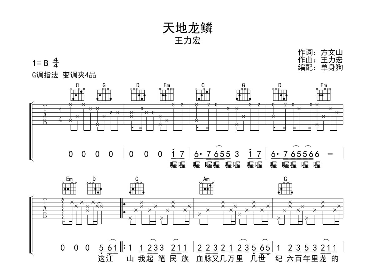 《天地龙鳞》是王力宏演唱的一首歌曲,本吉他谱采用的是G调指法编配,这份吉他谱共有三张高清图谱,图谱由 @单身狗 编配上传,图谱使用六线谱编配,包含吉他和弦指法、简谱以及歌词部分,使用这份天地龙鳞吉他谱,可以让你更加方便地掌握这首歌曲的弹唱技巧,快来尝试吧。王力宏《天地龙鳞》吉他弹唱谱,采用G调指法编配,单身狗编配出品,共有3张高清图谱。