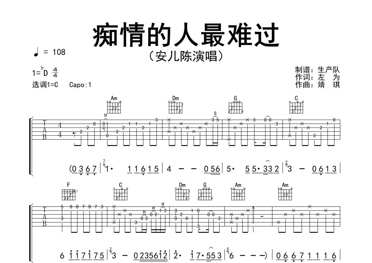 《痴情的人最难过》是安儿陈演唱的一首歌曲,精编完美版,拍号为4/4拍,歌曲速度为每分钟108拍,歌曲原调为Db调,但由于原调指法比较难,为了方便弹奏,本吉他谱采用的是C调指法编配,变调夹1品弹奏即为原调,当然也可以根据自己的音域改变变调夹位置,或者通过改变和弦调性,以方便自己弹奏,这份吉他谱共有三张高清图谱,图谱由 @生产队 编配上传,图谱使用六线谱编配,包含吉他和弦指法、简谱以及歌词部分,使用这份痴情的人最难过吉他谱,可以让你更加方便地掌握这首歌曲的弹唱技巧,快来尝试吧。安儿陈演唱的歌曲《痴情的人最难过》原版吉他谱,含前奏、间奏、尾奏solo编配,精编完美版,值得推荐!。