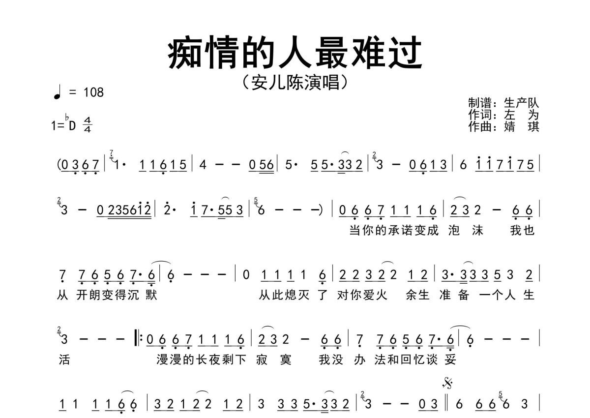 《痴情的人最难过》是安儿陈演唱的一首歌曲,原版简谱,拍号为4/4拍,歌曲速度为每分钟108拍,这份简谱共有一张高清图谱,图谱由 @生产队 编配上传安儿陈演唱的歌曲《痴情的人最难过》原版简谱,含前奏、间奏、尾奏solo编配,精编完美版,值得推荐!。