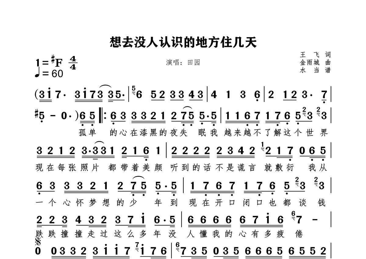 《想去没人认识的地方住几天》是田园演唱的一首歌曲,拍号为4/4拍,歌曲速度为每分钟60拍,这份简谱共有一张高清图谱,图谱由 @水当 编配上传原调#F。