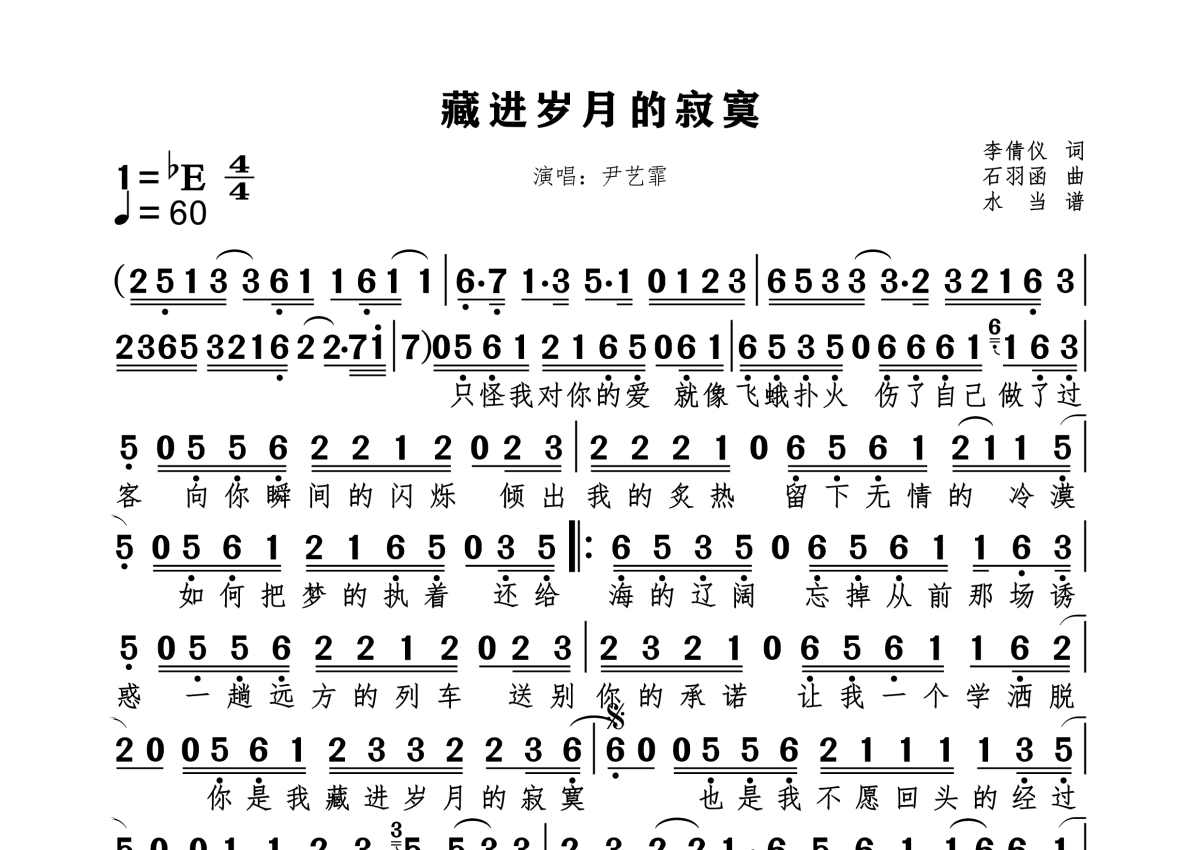 《藏进岁月的寂寞》是尹艺霏演唱的一首歌曲,拍号为4/4拍,歌曲速度为每分钟60拍,这份简谱共有一张高清图谱,图谱由 @水当 编配上传原调bE。