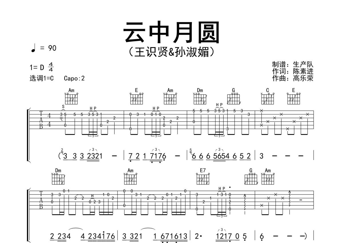 王识贤&孙淑媚《云中月圆》吉他谱 - C调弹唱六线谱 - 精编完美版