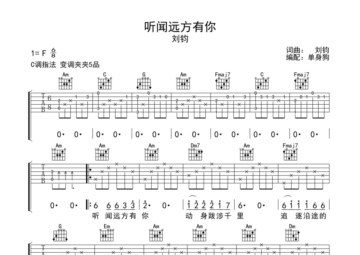 刘钧《听闻远方有你》吉他谱 - C调弹唱六线谱