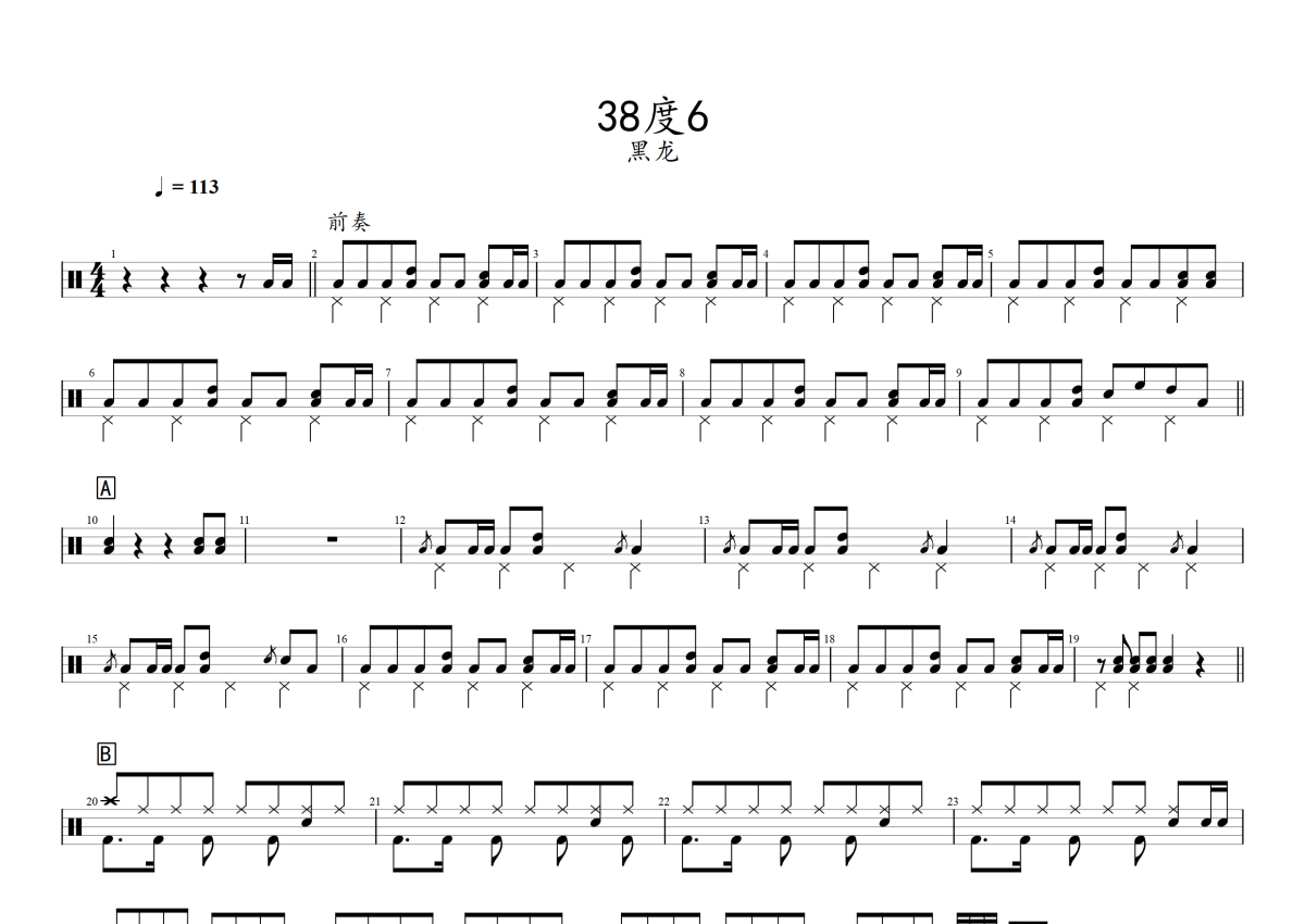 《38度6》是黑龙演唱的一首歌曲,拍号为4/4拍,歌曲速度为每分钟113拍,这份架子鼓谱共有两张高清图谱,图谱由 @音符喷血者 编配上传,图谱使用五线谱编配,使用这份38度6架子鼓谱,你将能够轻松地敲打出这首黑龙的38度6,快来尝试吧。