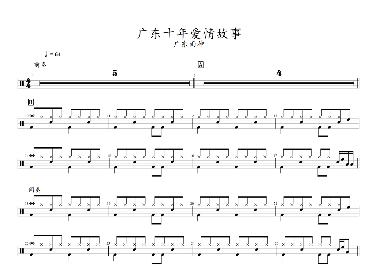 广东雨神《广东十年爱情故事》架子鼓谱
