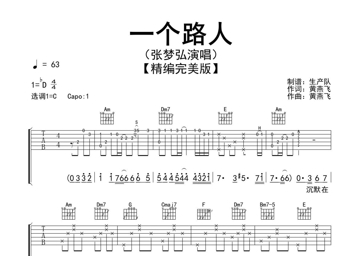 《一个路人》是张梦弘演唱的一首歌曲,精编完美版,拍号为4/4拍,歌曲速度为每分钟63拍,歌曲原调为Db调,但由于原调指法比较难,为了方便弹奏,本吉他谱采用的是C调指法编配,变调夹1品弹奏即为原调,当然也可以根据自己的音域改变变调夹位置,或者通过改变和弦调性,以方便自己弹奏,这份吉他谱共有三张高清图谱,图谱由 @生产队 编配上传,图谱使用六线谱编配,包含吉他和弦指法、简谱以及歌词部分,使用这份一个路人吉他谱,可以让你更加方便地掌握这首歌曲的弹唱技巧,快来尝试吧。张梦弘演唱的歌曲《一个路人》原版吉他谱,含前奏、间奏、尾奏solo编配,精编完美版,值得推荐!。