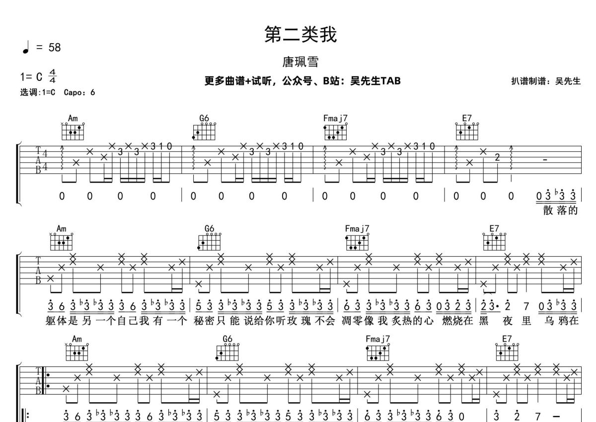 《第二类我》是唐珮雪演唱的一首歌曲,歌曲速度为每分钟58拍,歌曲原调为Gb调,但由于原调指法比较难,为了方便弹奏,本吉他谱采用的是C调指法编配,变调夹6品弹奏即为原调,当然也可以根据自己的音域改变变调夹位置,或者通过改变和弦调性,以方便自己弹奏,这份吉他谱共有一张高清图谱,图谱由 @吴先生TAB 编配上传,图谱使用六线谱编配,包含吉他和弦指法、简谱以及歌词部分,曲谱配备了相关的音频提供试听,使用这份第二类我吉他谱,可以让你更加方便地掌握这首歌曲的弹唱技巧,快来尝试吧。