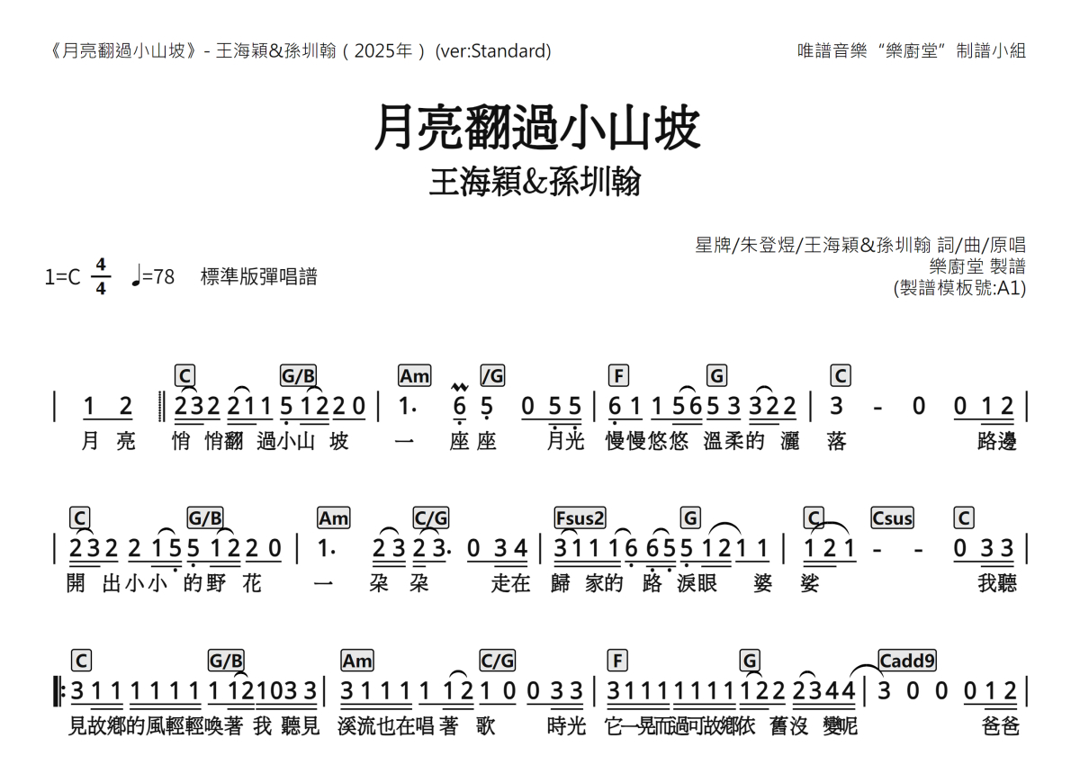 王海颖 孙圳翰《月亮翻过小山坡》简谱 - 标准版弹唱谱
