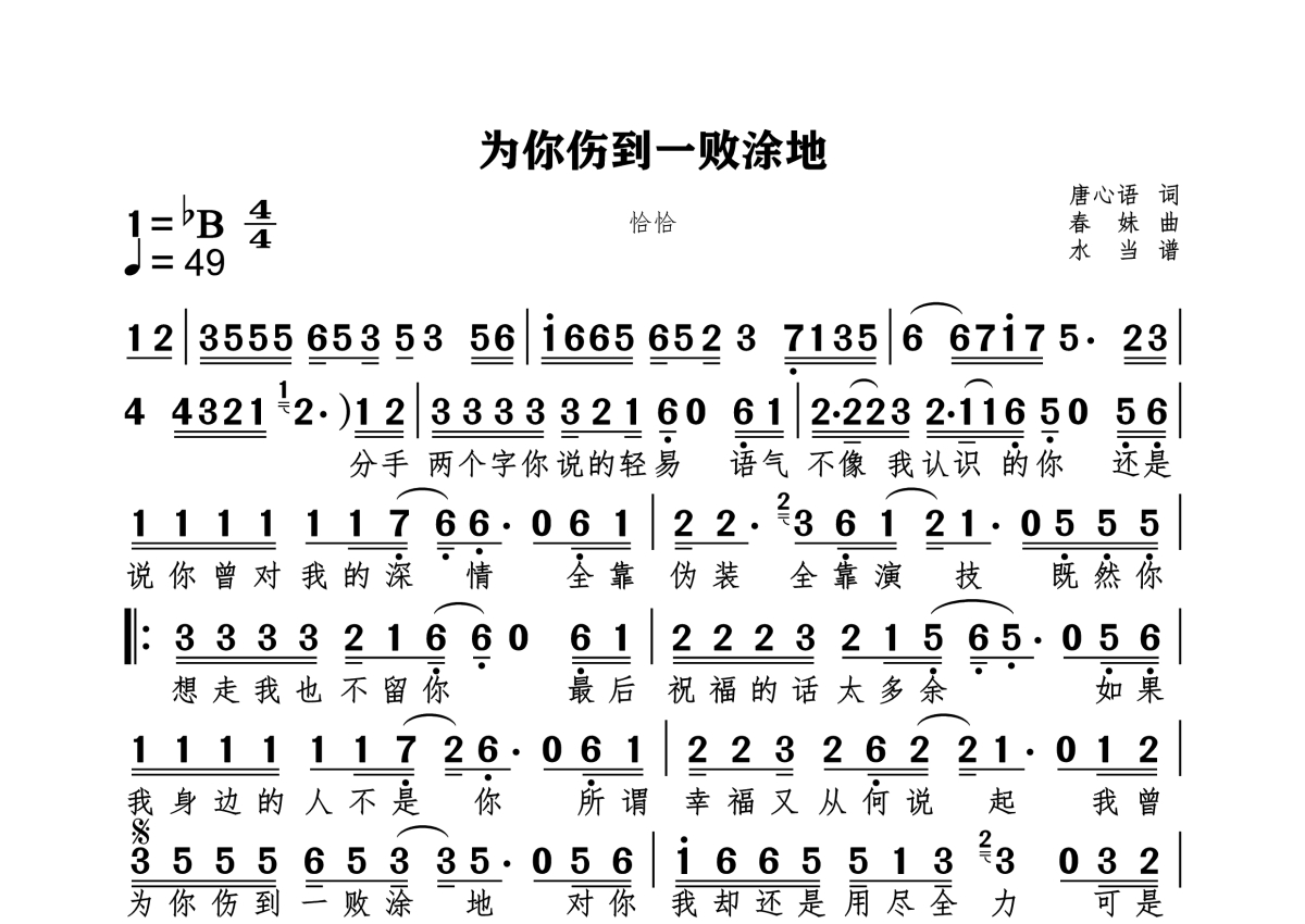 《为你伤到一败涂地》是恰恰恰恰恰演唱的一首歌曲,标和弦版,这份简谱共有两张高清图谱,图谱由 @水当 编配上传原调bB,按49每拍记谱,标和弦版本和未标和弦版本一并上传,请选择使用。