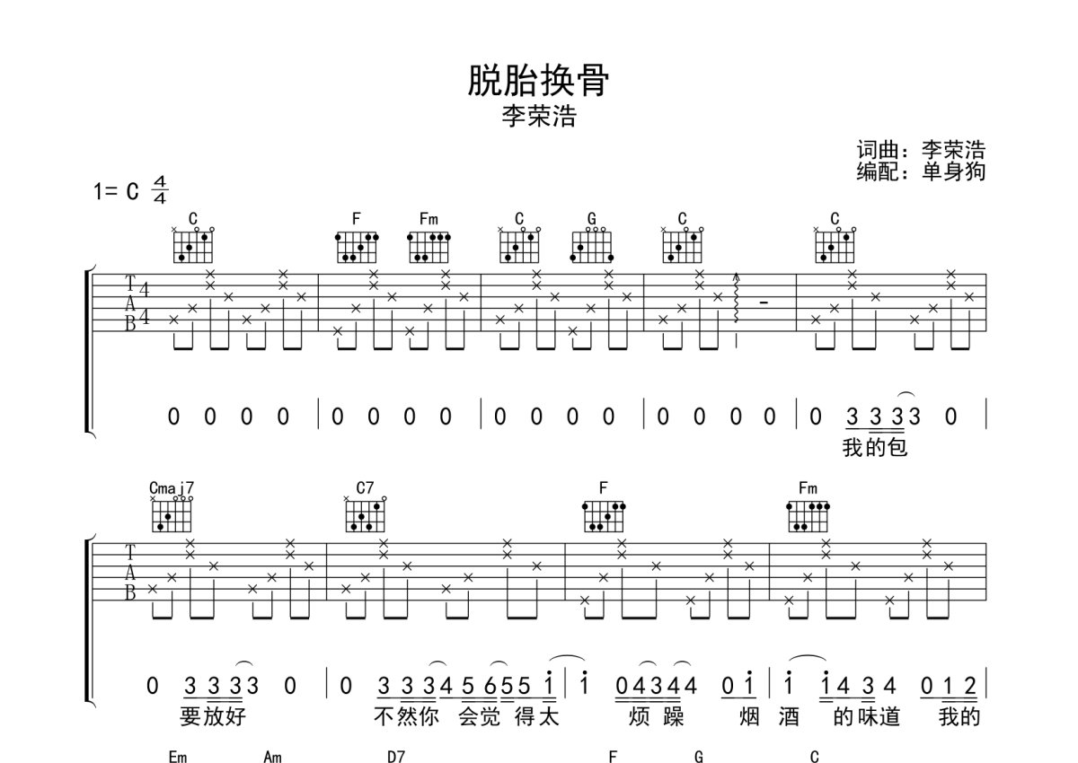 李荣浩《脱胎换骨》吉他谱 - C调弹唱六线谱