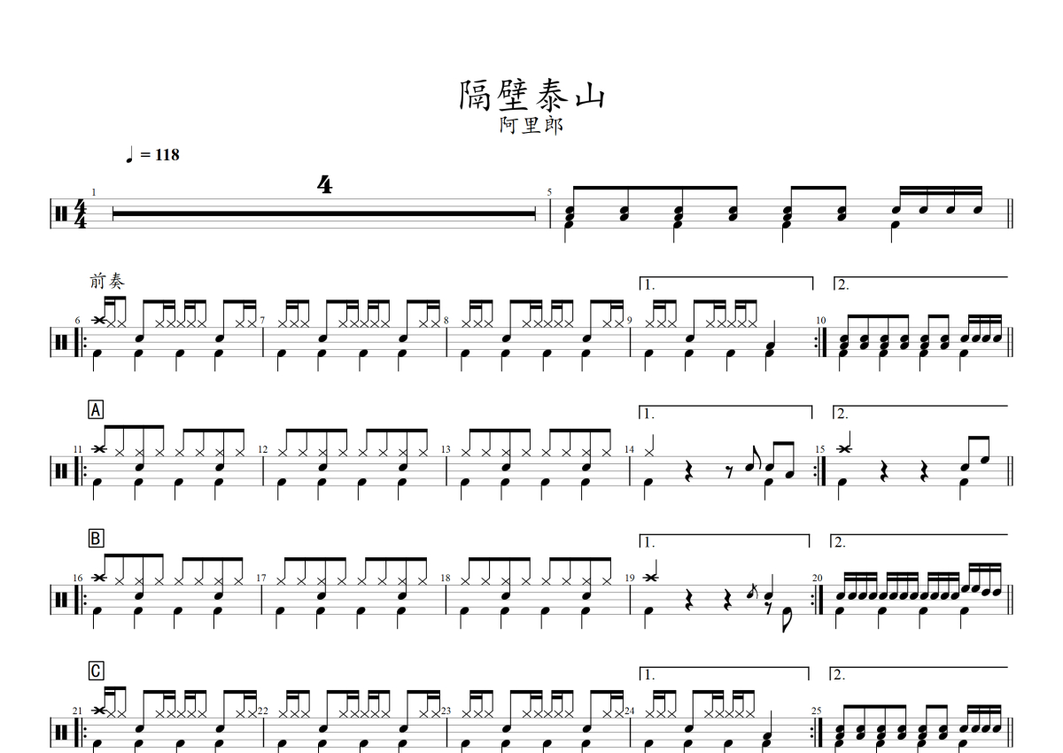 《隔壁泰山》是阿里郎演唱的一首歌曲,拍号为4/4拍,歌曲速度为每分钟118拍,这份架子鼓谱共有两张高清图谱,图谱由 @音符喷血者 编配上传,图谱使用五线谱编配,使用这份隔壁泰山架子鼓谱,你将能够轻松地敲打出这首阿里郎的隔壁泰山,快来尝试吧。