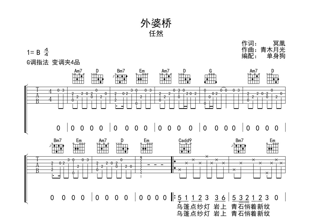 《外婆桥》是任然演唱的一首歌曲,本吉他谱采用的是G调指法编配,这份吉他谱共有三张高清图谱,图谱由 @单身狗 编配上传,图谱使用六线谱编配,包含吉他和弦指法、简谱以及歌词部分,使用这份外婆桥吉他谱,可以让你更加方便地掌握这首歌曲的弹唱技巧,快来尝试吧。任然《外婆桥》吉他弹唱谱,采用G调指法编配,单身狗编配出品,共有3张高清图谱。
