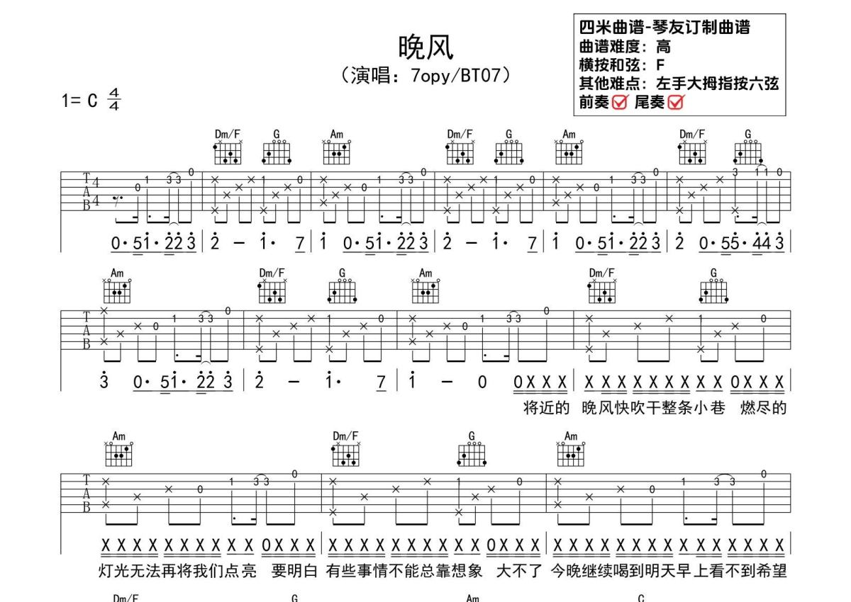 7opy/BT07《晚风》吉他谱 - C调弹唱六线谱