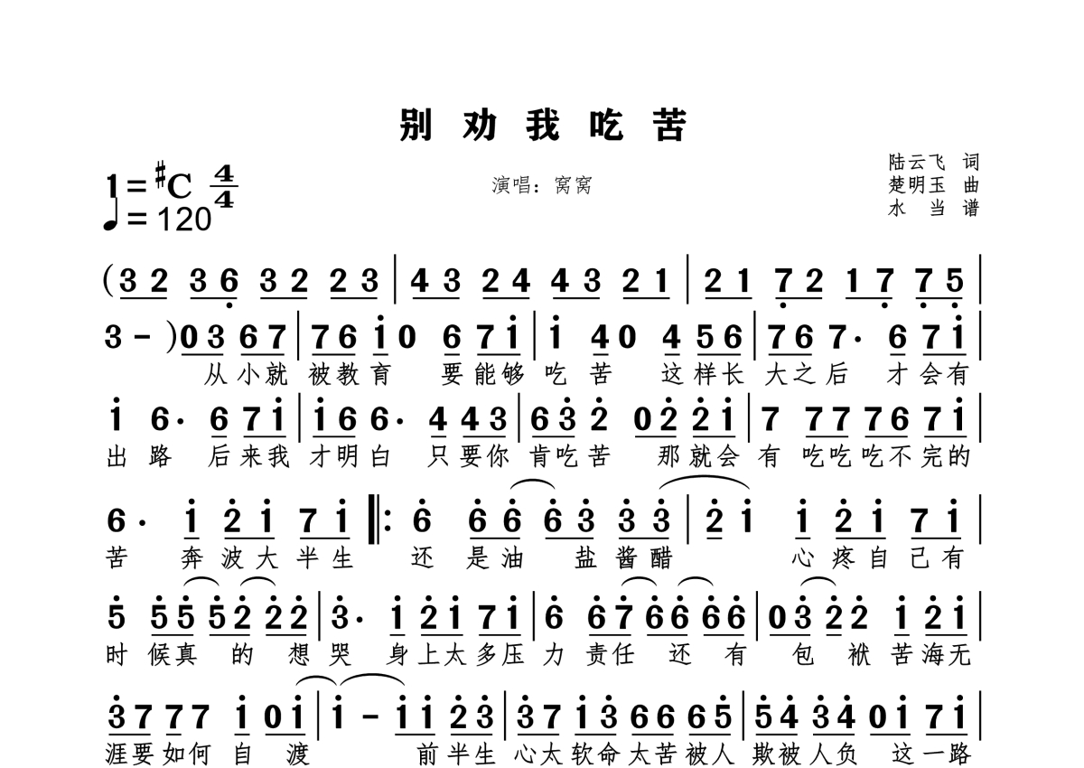 《别劝我吃苦》是窝窝演唱的一首歌曲,拍号为4/4拍,歌曲速度为每分钟120拍,这份简谱共有一张高清图谱,图谱由 @水当 编配上传原调#C单简谱。