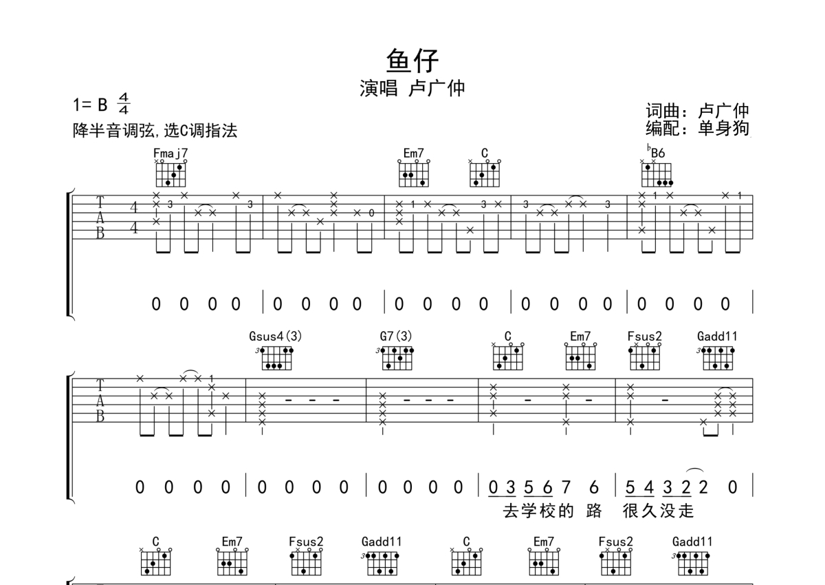 《鱼仔》是卢广仲演唱的一首歌曲,拍号为4/4拍,歌曲原调为B调,但由于原调指法比较难,为了方便弹奏,本吉他谱采用的是C调指法编配,降半音调弦弹奏即为原调,当然也可以根据自己的音域决定是否调弦,这份吉他谱共有五张高清图谱,图谱由 @单身狗 编配上传,图谱使用六线谱编配,包含吉他和弦指法、简谱以及歌词部分,使用这份鱼仔吉他谱,可以让你更加方便地掌握这首歌曲的弹唱技巧,快来尝试吧。