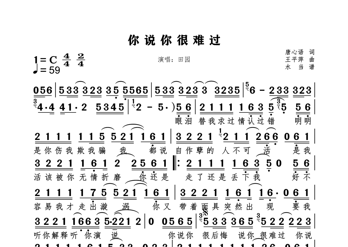 《你说你很难过》是田园演唱的一首歌曲,拍号为4/4拍,歌曲速度为每分钟26拍,这份简谱共有一张高清图谱,图谱由 @水当 编配上传原调C纯简谱。