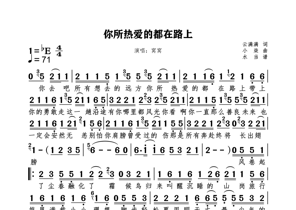 《你所热爱的都在路上》是窝窝演唱的一首歌曲,拍号为4/4拍,歌曲速度为每分钟71拍,这份简谱共有一张高清图谱,图谱由 @水当 编配上传原调bE纯简谱。