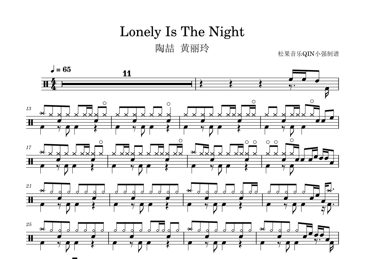 《Lonely Is The Night》是陶喆、A-Lin演唱的一首歌曲,拍号为4/4拍,这份架子鼓谱共有两张高清图谱,图谱由 @松果音乐QIN小强 编配上传,图谱使用五线谱编配,使用这份Lonely Is The Night架子鼓谱,你将能够轻松地敲打出这首陶喆、A-Lin的Lonely Is The Night,快来尝试吧。《Lonely Is The Night》是陶喆、A-Lin演唱的歌曲,发布于2025年4月15日。