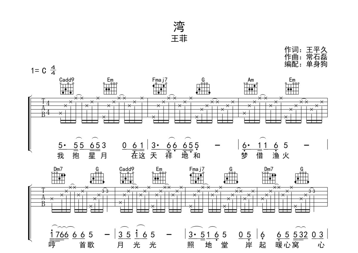 王菲《湾》吉他谱 - C调弹唱六线谱