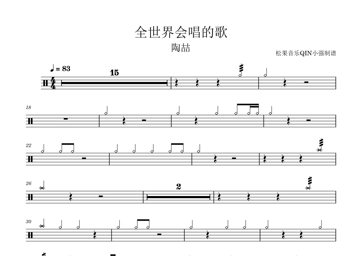 《全世界会唱的歌》是陶喆演唱的一首歌曲,这份架子鼓谱共有两张高清图谱,图谱由 @松果音乐QIN小强 编配上传,图谱使用五线谱编配,使用这份全世界会唱的歌架子鼓谱,你将能够轻松地敲打出这首陶喆的全世界会唱的歌,快来尝试吧。《全世界会唱的歌》是由陶喆演唱的歌曲,陶喆和娃娃作词,陶喆作曲,发行于2023年7月11日。
