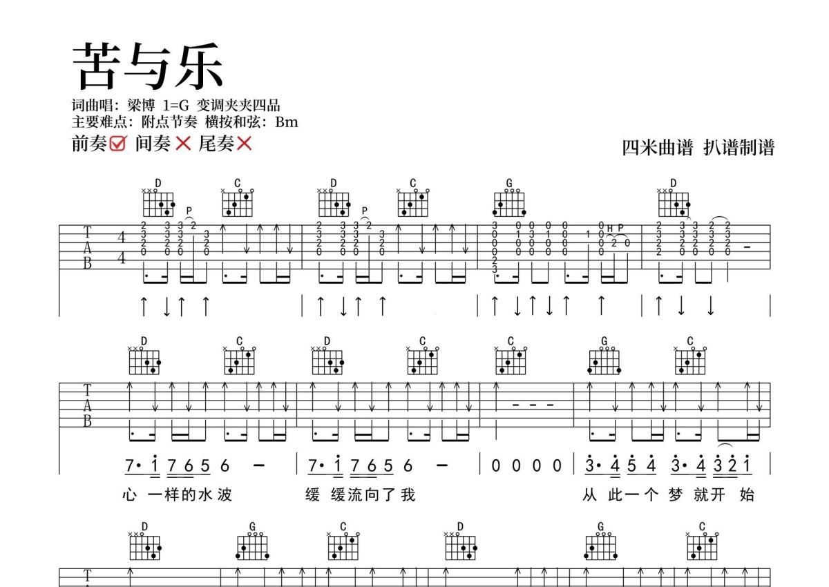 梁博《苦与乐》吉他谱 - G调弹唱六线谱
