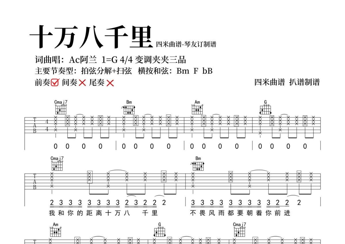 《十万八千里》是Ac阿兰演唱的一首歌曲,拍号为4/4拍,歌曲原调为Bb调,但由于原调指法比较难,为了方便弹奏,本吉他谱采用的是G调指法编配,变调夹3品弹奏即为原调,当然也可以根据自己的音域改变变调夹位置,或者通过改变和弦调性,以方便自己弹奏,这份吉他谱共有三张高清图谱,图谱由 @SRV7758521 编配上传,图谱使用六线谱编配,包含吉他和弦指法、简谱以及歌词部分,使用这份十万八千里吉他谱,可以让你更加方便地掌握这首歌曲的弹唱技巧,快来尝试吧。