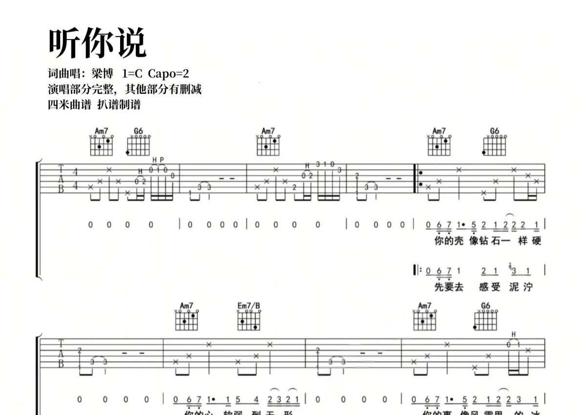 梁博《听你说》吉他谱 - C调弹唱六线谱