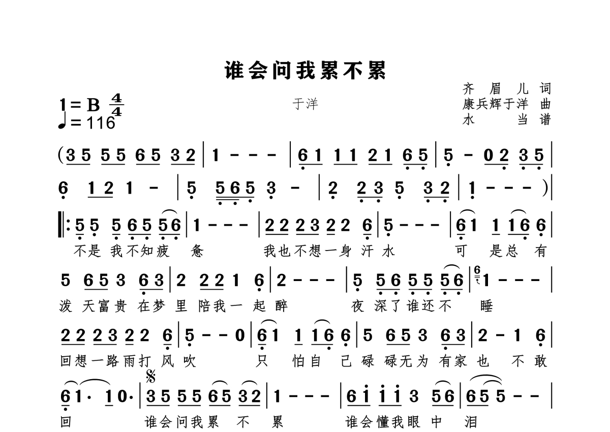 《谁会问我累不累》是于洋演唱的一首歌曲,拍号为4/4拍,歌曲速度为每分钟116拍,这份简谱共有一张高清图谱,图谱由 @水当 编配上传原调B,纯简谱。