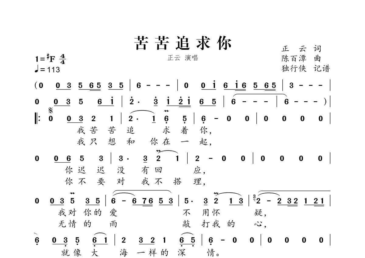 《苦苦追求你》是正云演唱的一首歌曲,拍号为4/4拍,歌曲速度为每分钟113拍,这份简谱共有一张高清图谱,图谱由 @独行侠 编配上传。