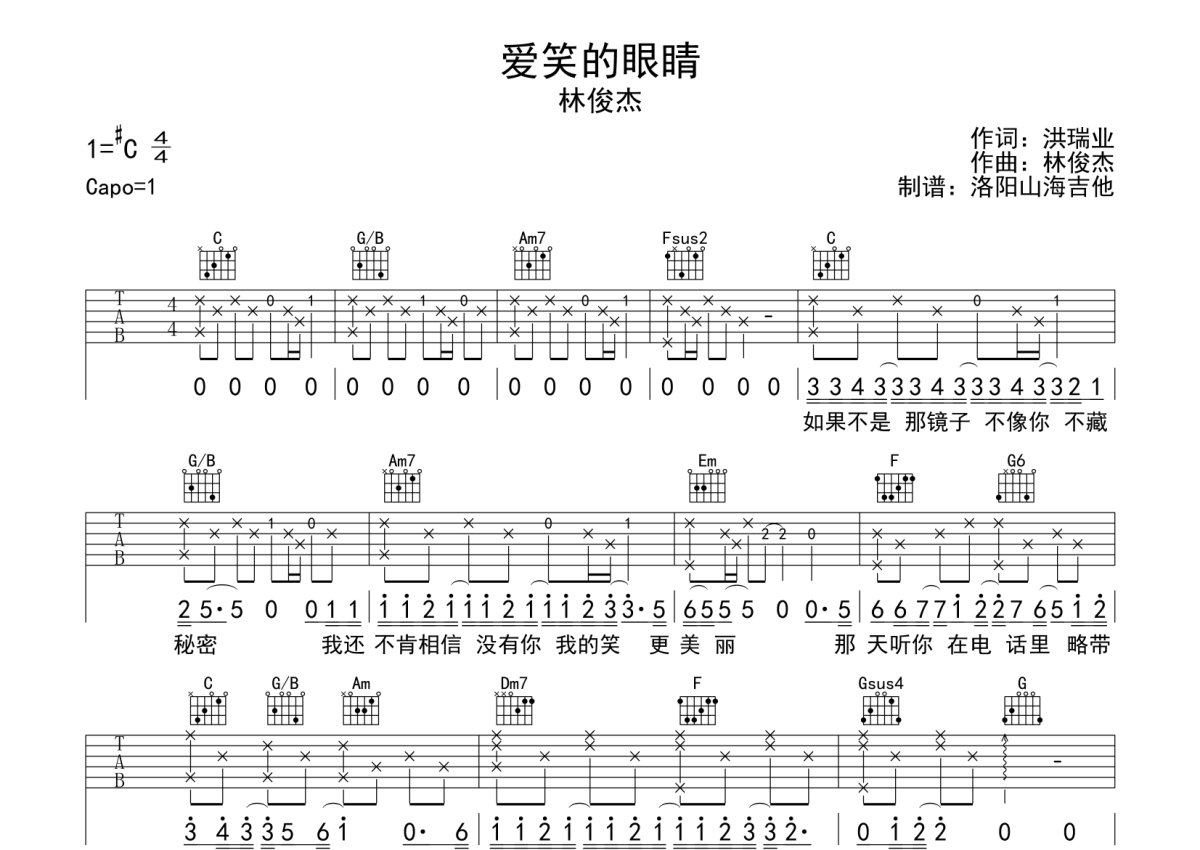 林俊杰《爱笑的眼睛》吉他谱 - C调弹唱六线谱