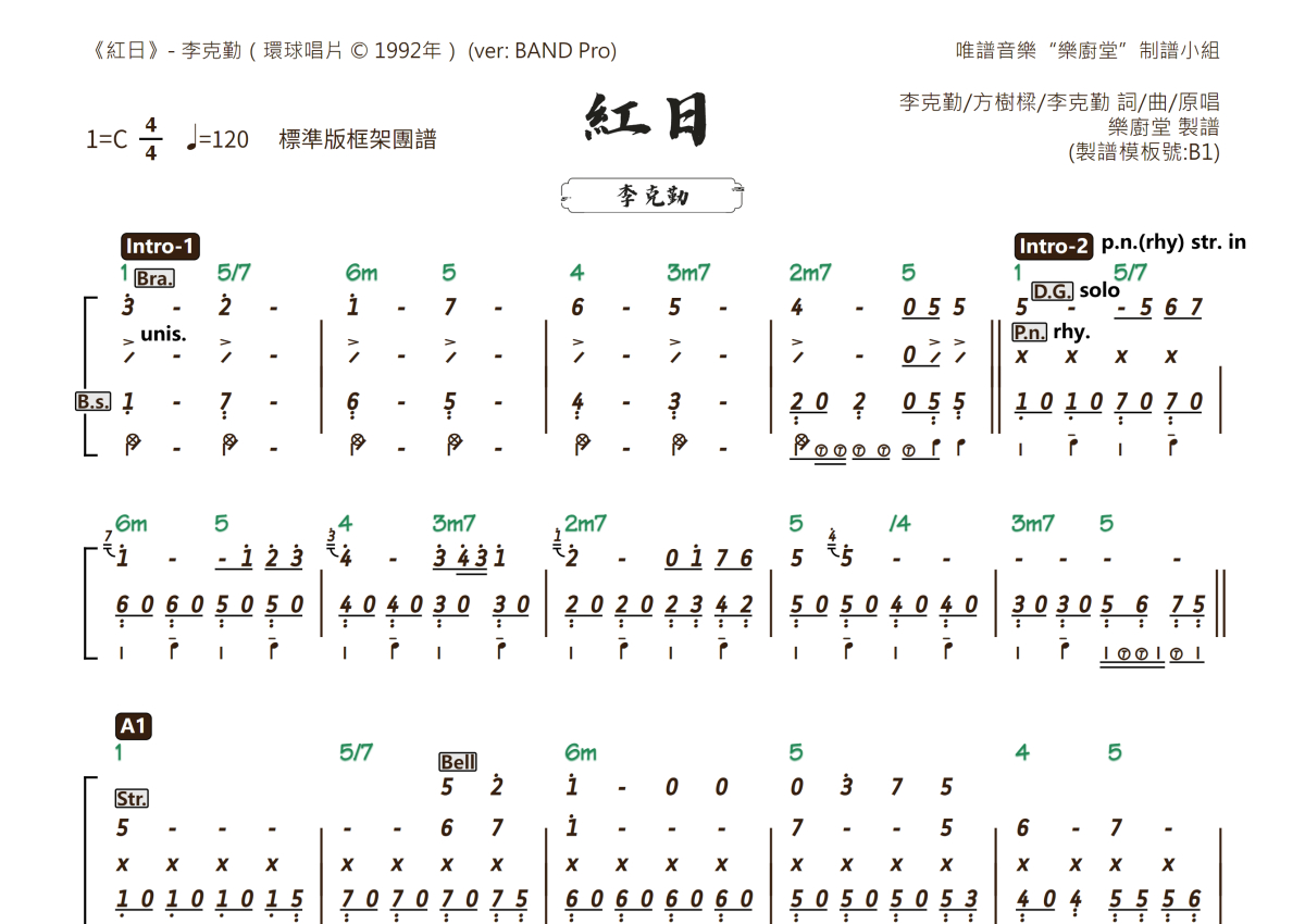 李克勤《红日》乐队总谱 - 框架团谱版
