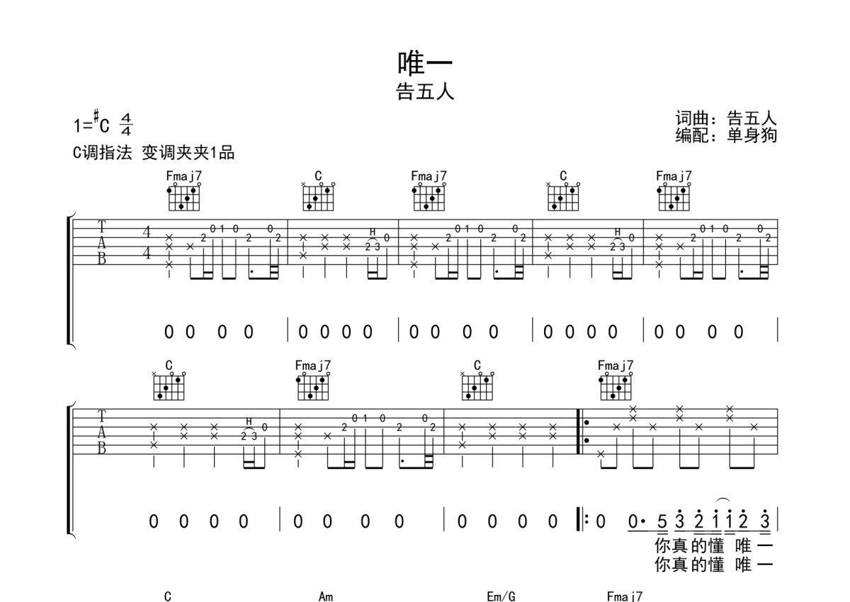 告五人《唯一》吉他谱 - C调弹唱六线谱