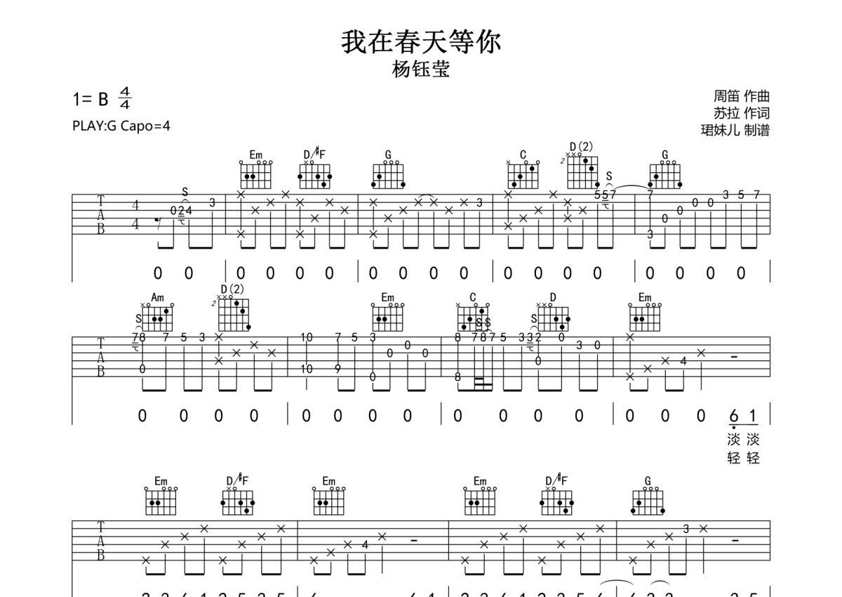 《我在春天等你》是杨钰莹演唱的一首歌曲,拍号为4/4拍,歌曲速度为每分钟85拍,歌曲原调为G调,本吉他谱采用的是G调指法编配,变调夹4品弹奏即为原调,当然也可以根据自己的音域改变变调夹位置,或者通过改变和弦调性,以方便自己弹奏,这份吉他谱共有两张高清图谱,图谱由 @珺妹儿 编配上传,图谱使用六线谱编配,包含吉他和弦指法、简谱以及歌词部分,使用这份我在春天等你吉他谱,可以让你更加方便地掌握这首歌曲的弹唱技巧,快来尝试吧。