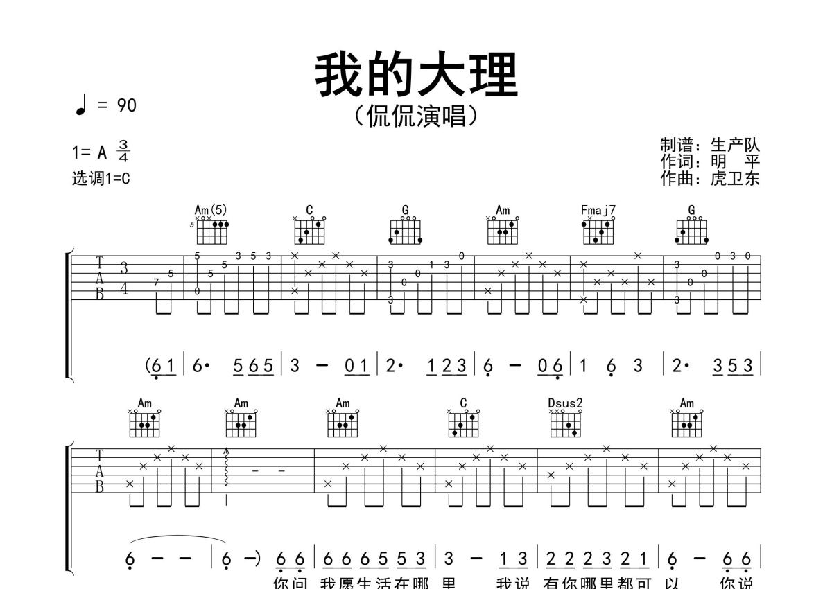 《我的大理(C调版)》是C调版演唱的一首歌曲,精编民谣版,拍号为3/4拍,歌曲速度为每分钟90拍,歌曲原调为A调,但由于原调指法比较难,为了方便弹奏,本吉他谱采用的是C调指法编配,变调夹4品弹奏即为原调,当然也可以根据自己的音域改变变调夹位置,或者通过改变和弦调性,以方便自己弹奏,这份吉他谱共有三张高清图谱,图谱由 @生产队 编配上传,图谱使用六线谱编配,包含吉他和弦指法、简谱以及歌词部分,使用这份我的大理(C调版)吉他谱,可以让你更加方便地掌握这首歌曲的弹唱技巧,快来尝试吧。侃侃演唱的民谣歌曲《我的大理》原版吉他谱,根据原版采用C调指法编配,完整的前奏、间奏、尾奏solo编配,精编版,值得推荐!。