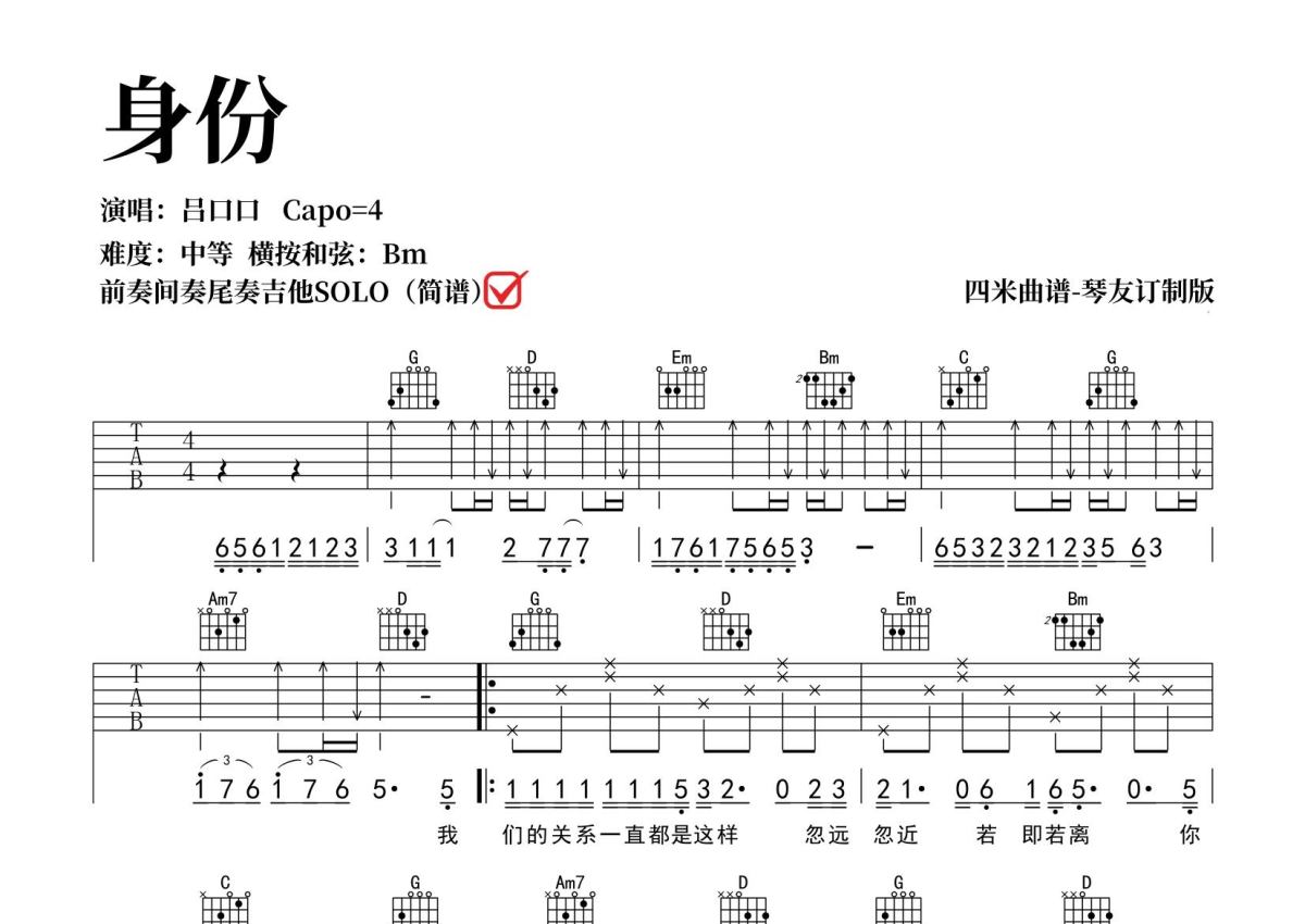 《身份》是艾岩吕口口演唱的一首歌曲,拍号为4/4拍,歌曲原调为B调,但由于原调指法比较难,为了方便弹奏,本吉他谱采用的是G调指法编配,变调夹4品弹奏即为原调,当然也可以根据自己的音域改变变调夹位置,或者通过改变和弦调性,以方便自己弹奏,这份吉他谱共有三张高清图谱,图谱由 @SRV7758521 编配上传,图谱使用六线谱编配,包含吉他和弦指法、简谱以及歌词部分,使用这份身份吉他谱,可以让你更加方便地掌握这首歌曲的弹唱技巧,快来尝试吧。