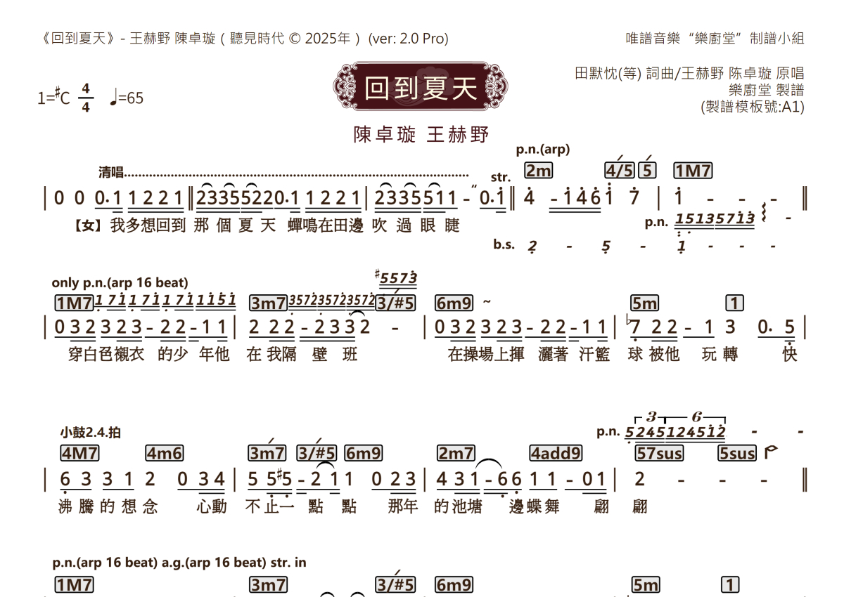 陈卓璇 王赫野《回到夏天》乐队总谱 - 2.0版团谱