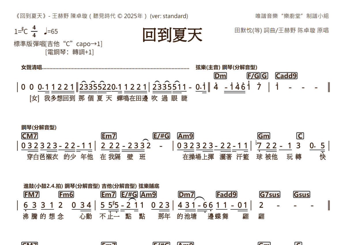 陈卓璇 王赫野《回到夏天》简谱 - 标准版弹唱谱