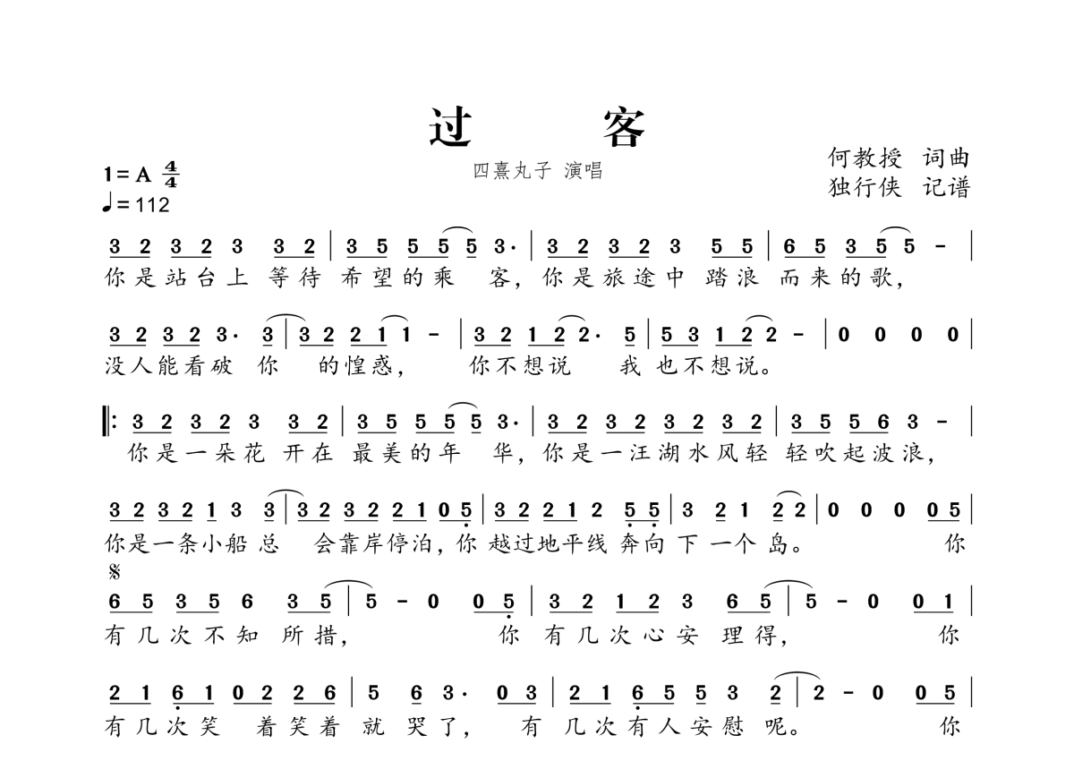 《过客》是四熹丸子演唱的一首歌曲,拍号为4/4拍,歌曲速度为每分钟112拍,这份简谱共有一张高清图谱,图谱由 @独行侠 编配上传。