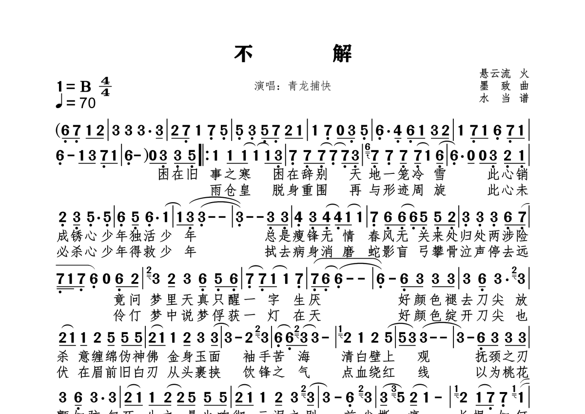 《不解》是青龙捕快演唱的一首歌曲,拍号为4/4拍,歌曲速度为每分钟70拍,这份简谱共有一张高清图谱,图谱由 @水当 编配上传。