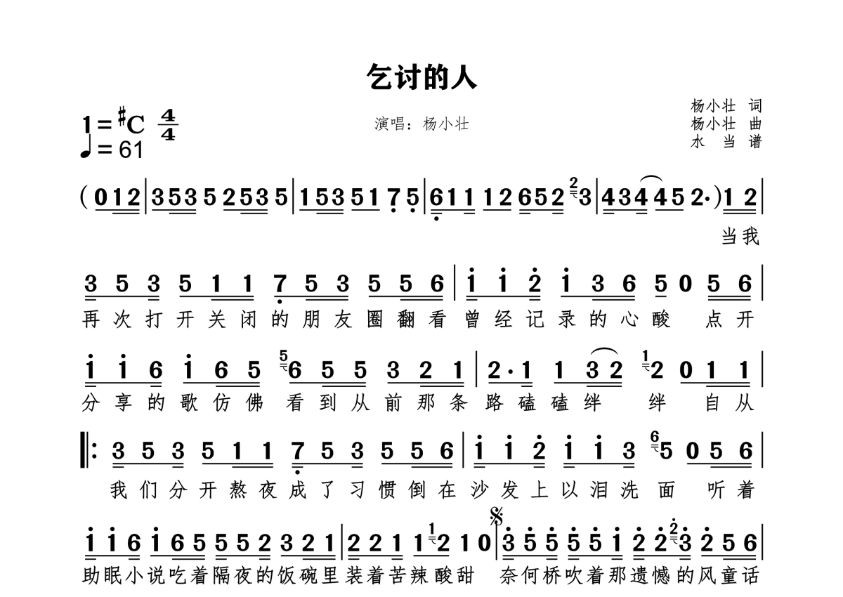 《乞讨的人》是杨小壮演唱的一首歌曲,拍号为4/4拍,歌曲速度为每分钟61拍,这份简谱共有一张高清图谱,图谱由 @水当 编配上传。
