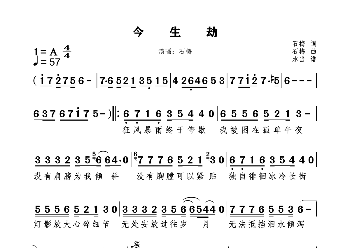 《今生劫》是石梅演唱的一首歌曲,拍号为4/4拍,歌曲速度为每分钟57拍,这份简谱共有一张高清图谱,图谱由 @水当 编配上传。