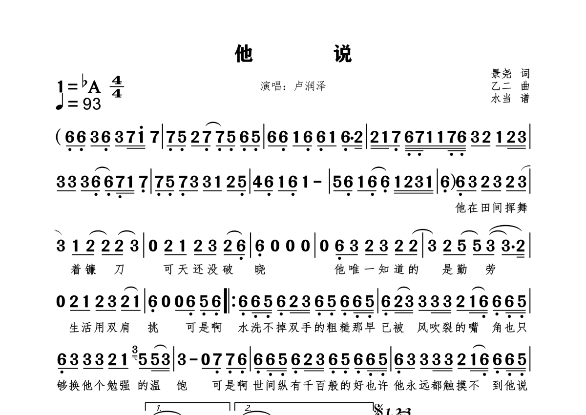 《他说》是卢润泽演唱的一首歌曲,拍号为4/4拍,歌曲速度为每分钟93拍,这份简谱共有一张高清图谱,图谱由 @水当 编配上传。